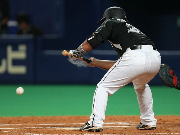 投手 チェン・ウェイン 1番 西岡 左翼二 1-1から真ん中低めのフォークボールに体勢を崩されながらも引っ張った打球は3塁線ギリギリのところを転がって、サード・森野の横を抜けていった!! 打った西岡は一気に2塁へ!! |
