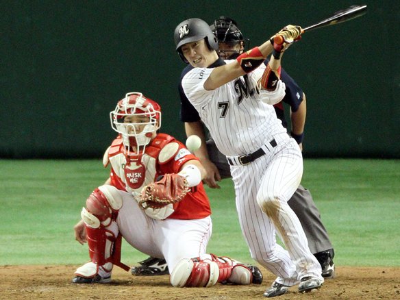 7番 里崎 右飛 初球、高めのボールを打ち上げてしまい、フラフラと上がった打球をセカンド、センター、ライトの3者が追いかけ、最後はライトがこれをつかんだ。 |