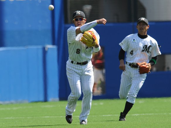 投手 ラズナー 8番 福浦 左飛 1-0から外角寄り高めのストレートを逆方向にはじき返した打球は、半身の体勢でバックするレフトにキャッチされてしまった。 |