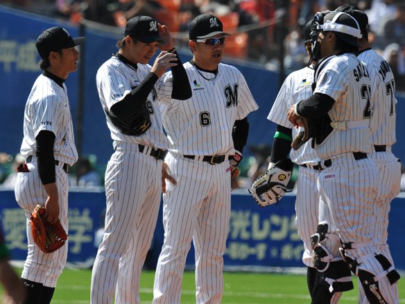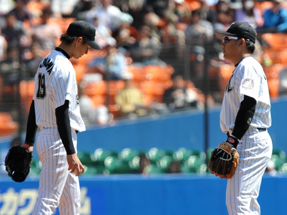 ここでセカンド・井口がマウンドに歩み寄り、ピッチャー・唐川に声をかけます。 |