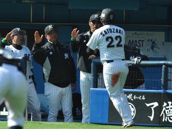 里崎が今季初ヒットで出塁すると、井口が猛打賞獲得となるタイムリーヒットを放って1点を返しました!! 試合は終盤に向かいます。もう一度チャンスを築き、一気に逆転を狙いましょう!! |