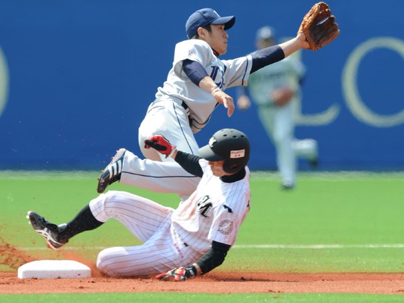 根元は盗塁を試みたが捕手からの送球に阻まれる