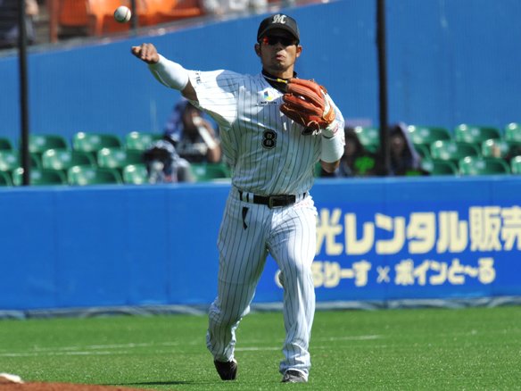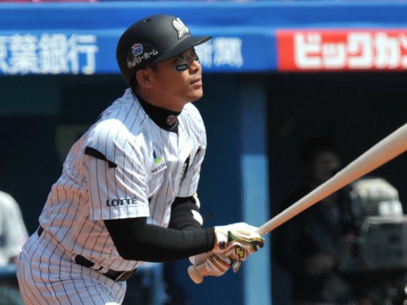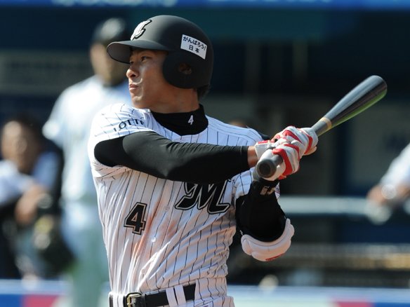 3番 井口 右安 3-1からの高めに浮いた変化球を右方向へ打ち返した打球は、右中間の浅い位置へ飛んだ! 2塁ランナーが生還しマリーンズが先制! 1対0! ![]() 1