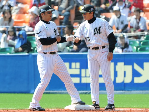 中前安打で出塁した里崎は山森コーチとグータッチ!