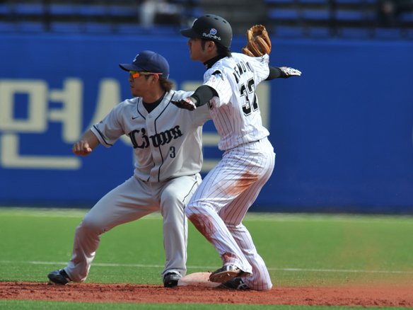 9番 里崎 中安 1-2からの5球目、低めのボールをうまくとらえた打球はセンターの横で弾んだ! これを見た1塁ランナー・金泰均は一気に3塁を陥れた! |