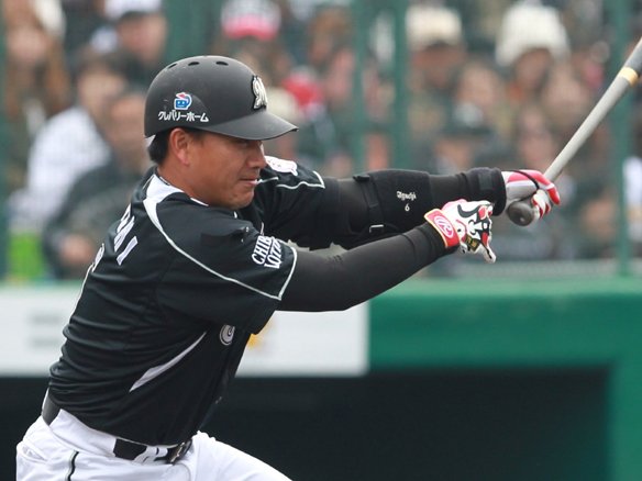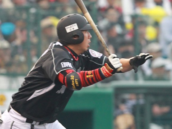 5番 サブロー 左中二 2-1からの内角低めのストレートを力負けせずに打ち返すと、ライナー性の打球は左中間を破っていった! 打ったサブローは2塁へ! 一発が出れば同点!! |