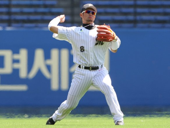 6番 李スンヨプ 左安 1-2から高めのシンカーを反対方向へ打ち返された打球は、レフトの前に落ちた。 |