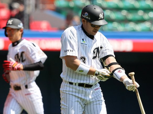 7番 里崎 二ゴ 3-1から高めのストレートを打ちにいった打球は二遊間へ転がるも、セカンドに回り込んで捕球され2塁へ送球された。 |