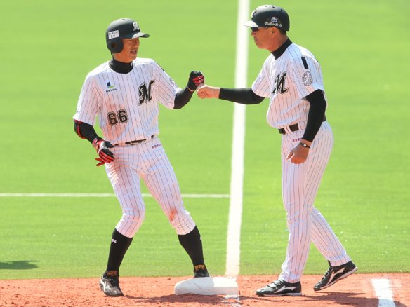 2アウトから福浦とサブローに連打が飛び出し得点圏にランナーを置きますが、ここは得点ならず。ここまで毎回ヒットを出しているので、この調子で積極性を失わずに攻めていきたい! |