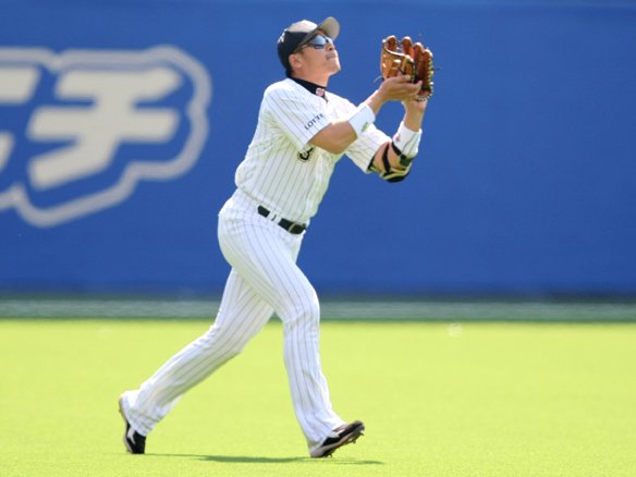 6番 李スンヨプ 中飛 2-2から内角へのシンカーで打ち上げさせた打球は、センターがライト方向へ回り込んでつかんだ! |
