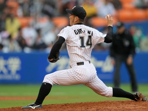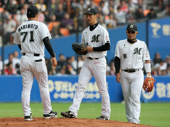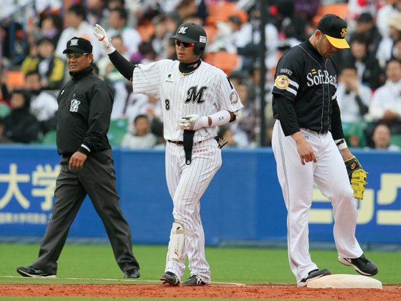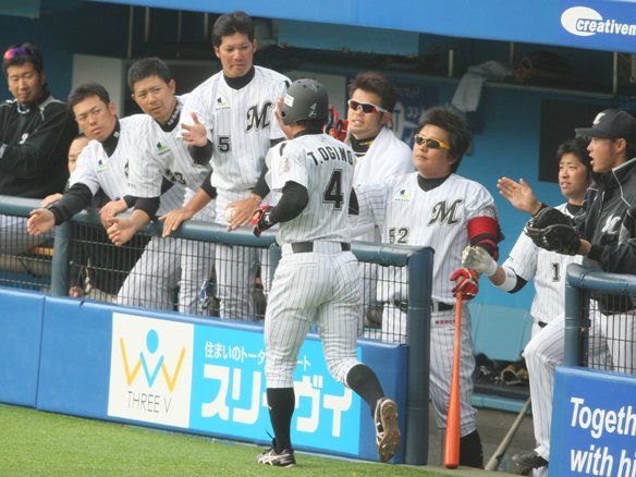 投手 大場 8番 里崎 四球 3-1から内角低めにボールが外れるのを落ち着いて見送った! |