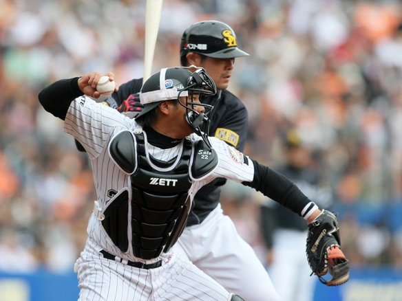 投手 攝津 8番 里崎 捕邪飛 初球、高めのストレートを後方へ打ち上げてしまった打球は、キャッチャーにファウルゾーンで捕球された。 |