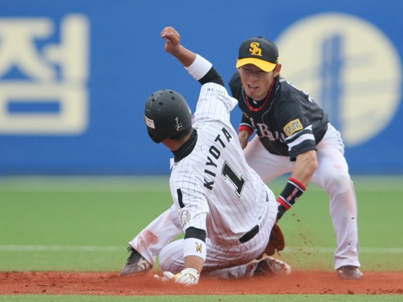 荻野貴の俊足を生かした攻撃が光り、初回に先制点を挙げました! 打線の援護を受けて光原が奮い立ちます! |