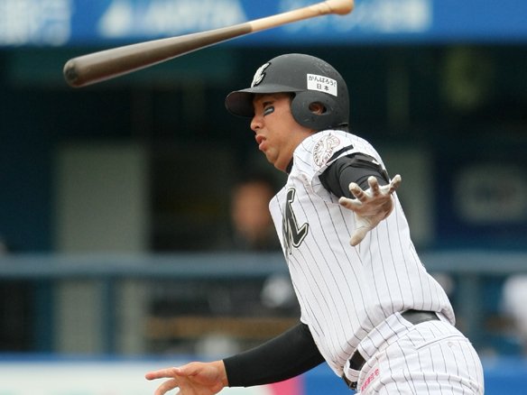 4番 サブロー 左中二 2-1から高めのストレートを振り抜いた強烈な打球は、左中間フェンスを直撃した! 打ったサブローは2塁へ! |