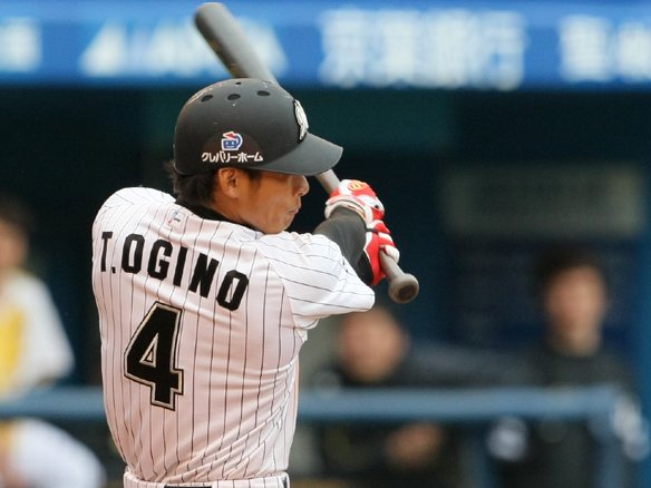 2番 荻野貴 右中二 0-1から外角の変化球を右方向へ打ち返した打球は右中間へ飛ぶ! ライトに素早く回り込まれるも、打った荻野貴は快足を飛ばし2塁を陥れた! |