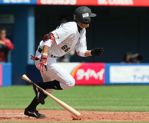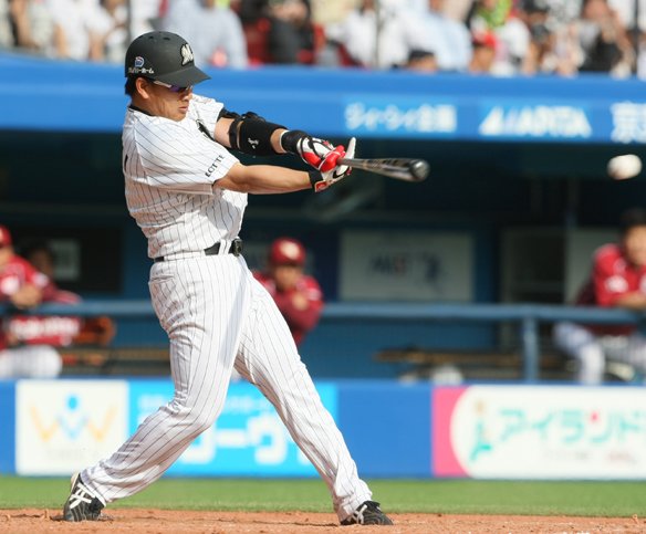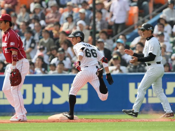 伊志嶺のバントヒットから、仕事人・井口がすかさずタイムリーヒットを放ち同点に! 初回から試合は目まぐるしく動きます!! |