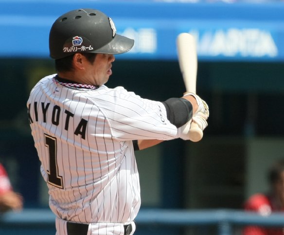 2番 鉄平 死球 1-2からの内角高めの変化球がバントの構えをした鉄平の頭に当たった。スイングかデッドボールの判定かで審判団で協議が行われ、結果デッドボールとなり試合再開。 |