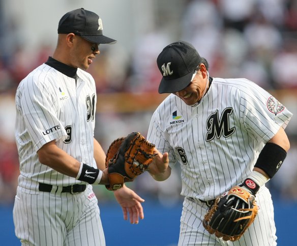ファインプレーを見せた井口は笑顔で福浦とタッチ