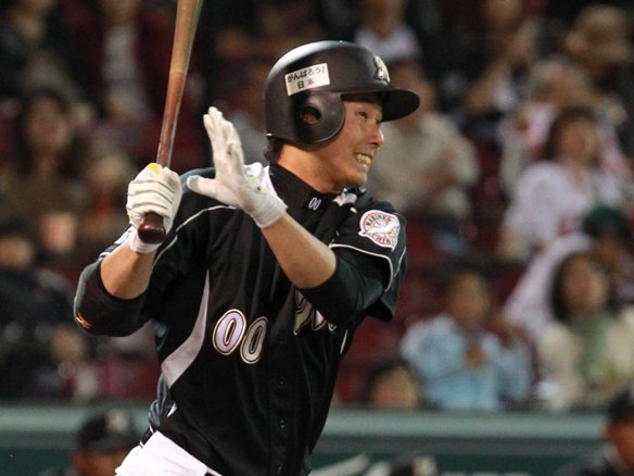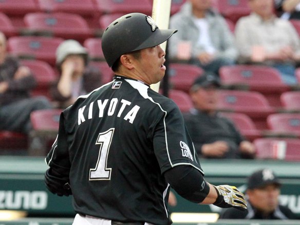 5番 里崎 中越二 1-1から低めのボールを思い切り振り抜くと、打球は大きな当たりとなってセンター方向へ! そのままフェンスを直撃し、里崎は2塁へ到達! 得点圏へ走者を置き、今日2安打の清田に打順が回る! |