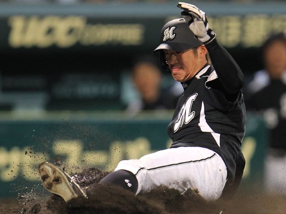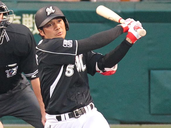 里崎がチーム10本目となるヒットを放ちますが、追加点を奪うことはできませんでした。最後の相手の攻撃を封じ、今日こそ連敗から脱出する! |