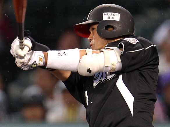 3番 マートン 右安 1-1から外角のストレートを一二塁間に合わせられた打球は、低いゴロとなってライトの前に転がっていった。 |