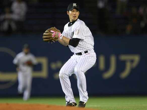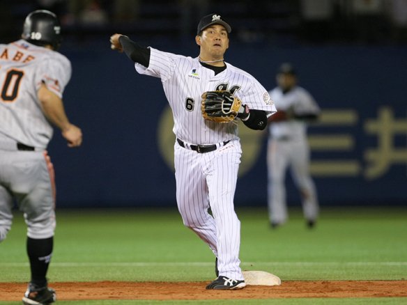 福浦は藤村のゴロを処理し1塁ベースカバーの薮田にトス!