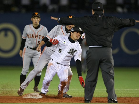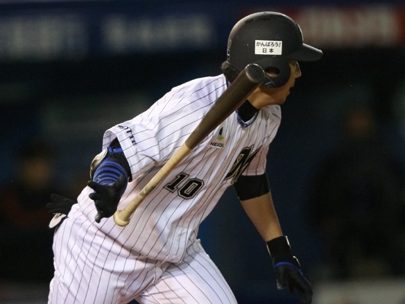 4番 福浦 左安 初球の外角のシュートをうまく引きつけて打つと、打球はジャンプしたショートの頭上を越えた! レフトが回り込んで処理する間に、1塁ランナーが3塁を陥れた! |