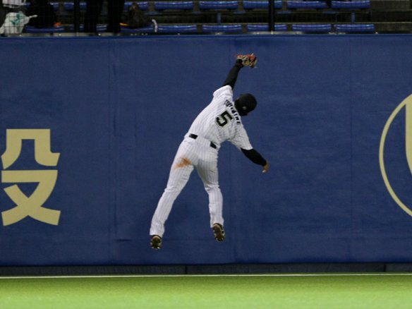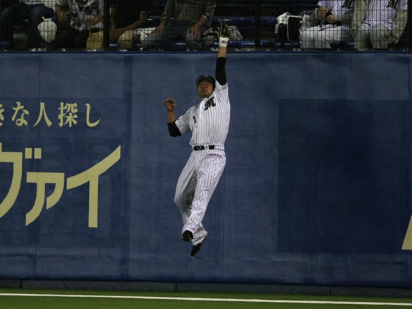 清田は古城の打球をフェンス際でジャンピングキャッチ!