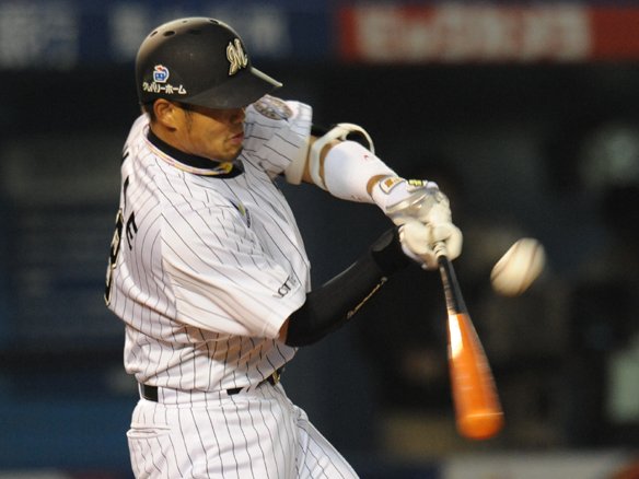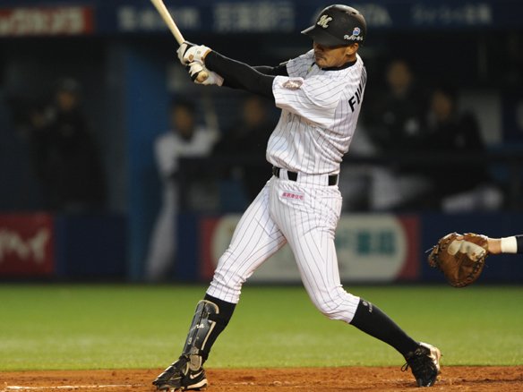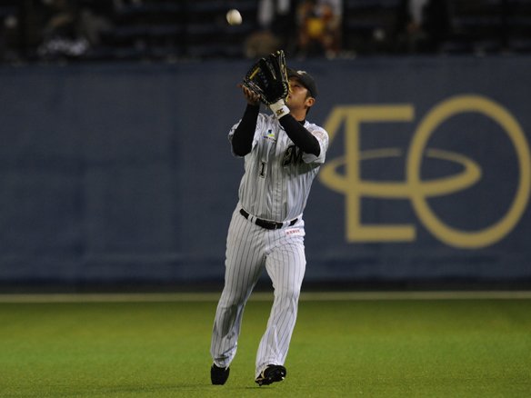 5番 バレンティン 中越二 初球、高めのストレートを打ち返され高く上がった打球は、センター・岡田がフェンス際でジャンプするもわずかに届かず、フェンス直撃の2ベースヒットとなった。 |