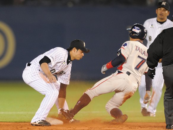2番 田中浩 遊ゴ失 2-1から外角へのボールで引っ掛けさせた打球はショートの守備範囲へ転がった。しかし1塁への送球が大きく浮いてしまい、ボールは1塁の後方へ。打った田中は2塁へ到達した。記録はショートのエラー。 |