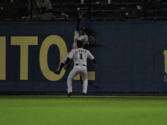 バレンティンの大飛球に岡田がジャンプするもあと一歩及ばず