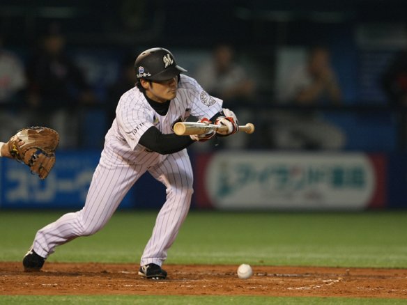 5番 里崎 三ゴ 1-1から外角低めのストレートを引っ掛けたボテボテのゴロはサードの前へ。当たりが弱いため2塁へは送球されず、1塁へ送球された。 |