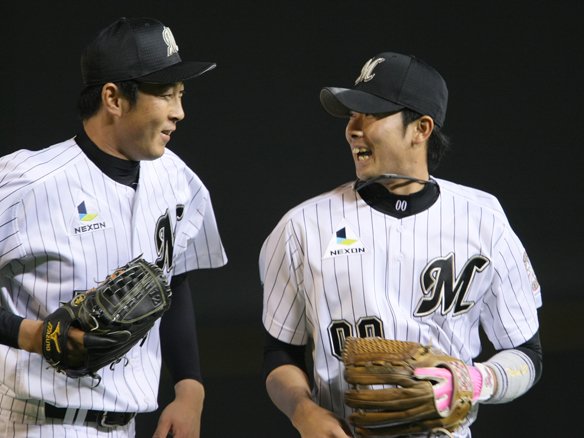 痛烈なゴロを処理した高濱を吉見が笑顔で迎える
