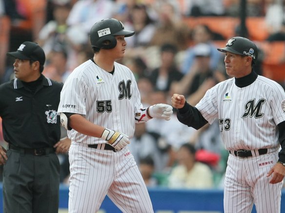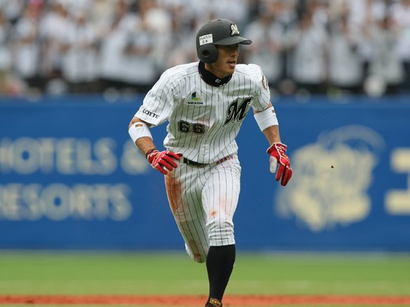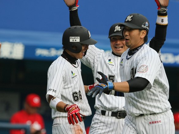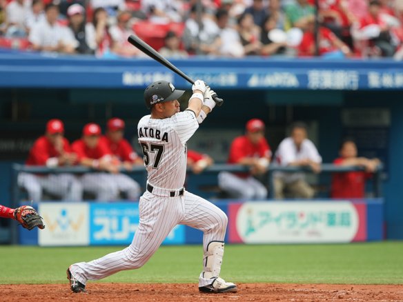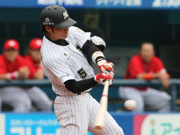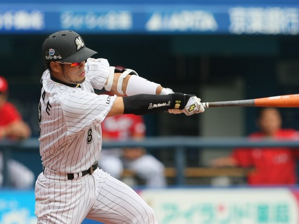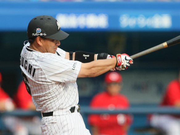 6番 福浦 中安 3-1から、外角低めのスライダーにうまくバットを合わせた打球は、ゴロとなってピッチャーの横を抜け、センターの前へと転がった! 2塁ランナーが一気に生還し2対0! ![]() 2