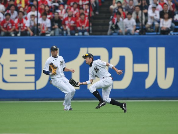 6番 福浦 中飛 2-1から外角低めのスライダーにバットをうまく合わせ、打球はセンター方向へ。ヒットになるかと思われたが、素早く前進するセンター・丸のダイビングキャッチに阻まれてしまった。 |