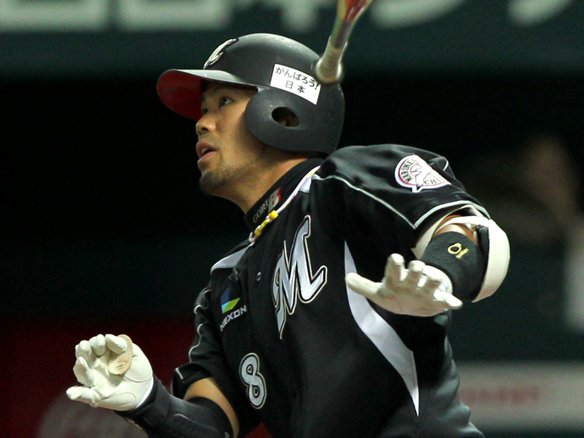 8番 里崎 中安 1-0からの外角へのスライダーをはじき返すと、鋭い打球がセンター前へ飛んでいった! |