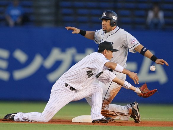 里崎が懸命に2塁へ送球するも盗塁を防げず