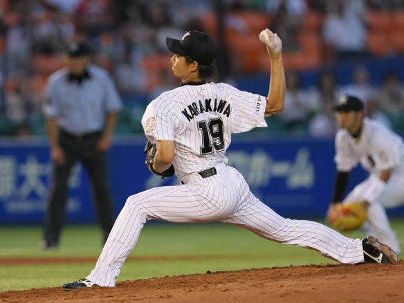 投手 西口 8番 里崎 右飛 初球、外角低めのスライダーにうまくタイミングを合わせるも、上がりすぎた打球はライトにキャッチされた。 |