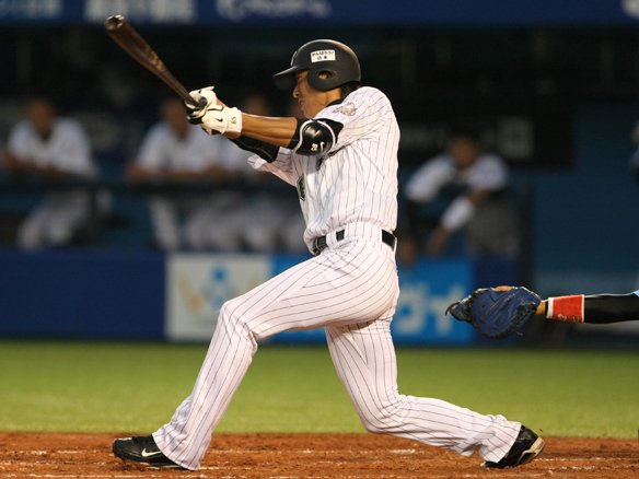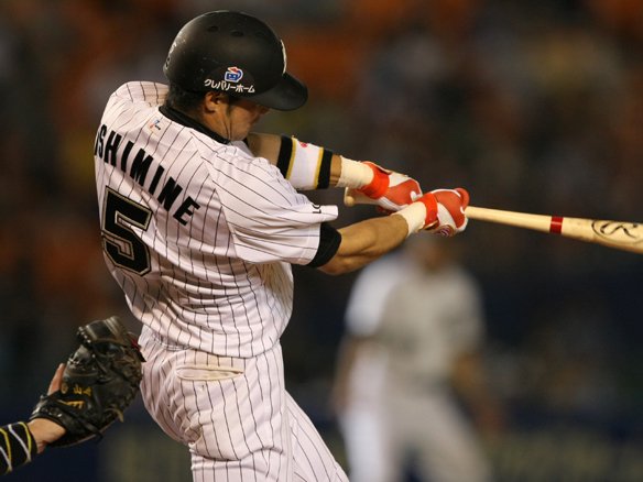 3番 松中 中越二 1-1から外角高めのストレートをはじき返された大きな打球は、センター・岡田が素早く下がって追い掛けるも、ジャンピングキャッチはわずかに及ばず。ワンバウンドしてフェンスに到達した打球を処理する間に、1塁ランナーは3塁へ進み、打った松中は2塁へ。 |
