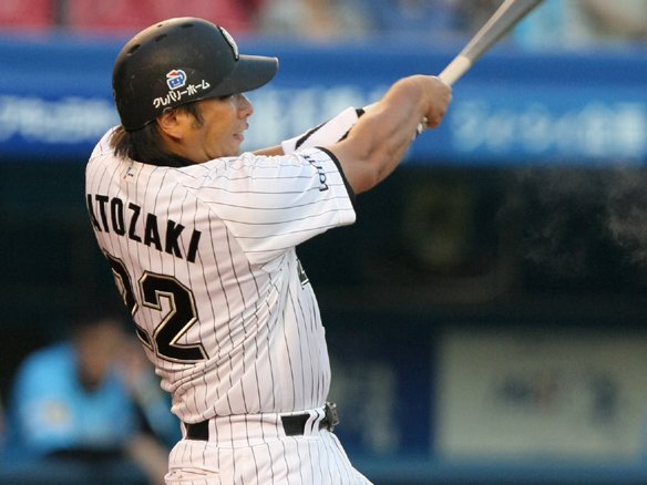 里崎は滞空時間の長い打球を放つが左飛に倒れる
