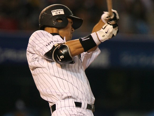8番 里崎 左安 2-1から外角低めのスライダーをうまく引っ張り、レフト前に運んだ! 再び満塁のチャンスを作り、逆転への機運を高める! |