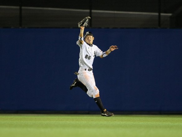 岡田は川崎の打球を軽快な動きでキャッチ!
