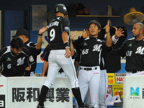 先制のホームを踏んだ福浦はハイタッチで迎えられる