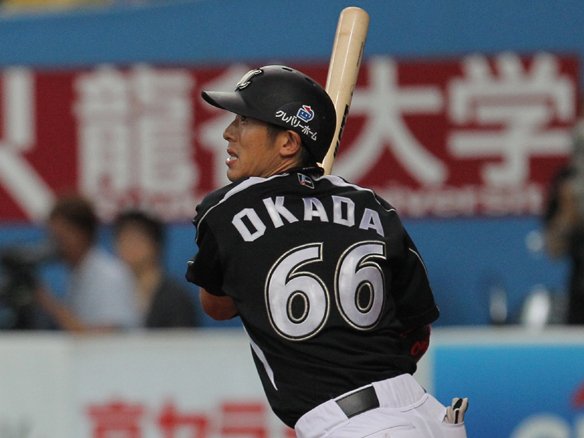 投手 平野佳 1番 岡田 投安 1-2から真ん中高めのフォークボールをたたいた打球は、ピッチャーのグラブをはじいてセカンドの前へ。セカンドが拾い上げたが、投げられずに内野安打となった!! |