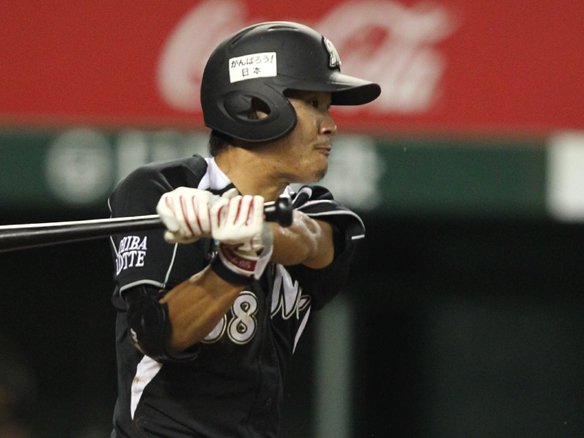 8番 里崎 二併 2-2から外角低めの変化球を右方向へはじき返すも、痛烈なゴロはセカンドの正面を突いてしまった。2塁へ送球されると、3塁へ向かおうとした2塁ランナーが挟まれてしまい、3塁付近でタッチアウト。ダブルプレーとなった。打った里崎はその間に2塁へ到達。 |
