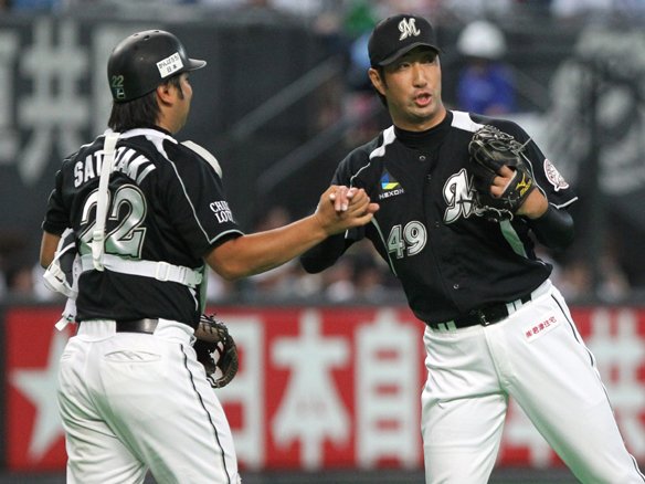 最終回を締めた守護神・薮田が里崎とハイタッチ!