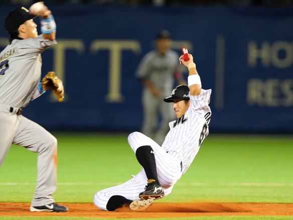 2番 伊志嶺 遊併 0-1からの外角高めのボールを打ち損じると、打球はショートの正面に。打った伊志嶺は懸命に1塁へ駆け込むも、6-4-3のダブルプレーに。プロ初の併殺打を喫してしまった。 |