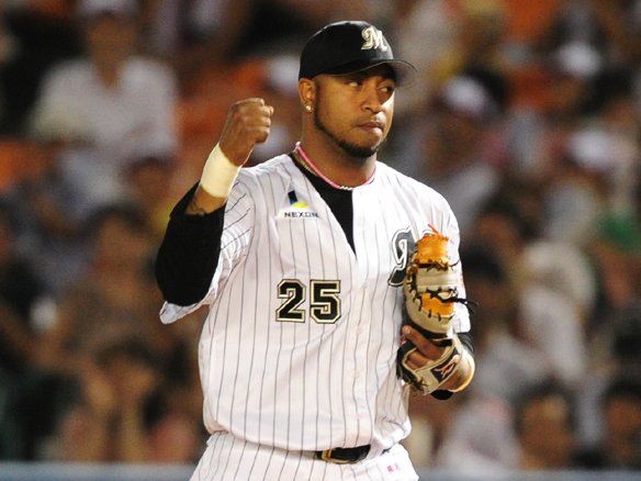 5番 バルディリス 投ゴ 1-0からの外角のストレートを打たせると、打球はワンバウンドでピッチャーの足元へ。ピッチャー・唐川が素早くこれにグラブを差し出し、がっちりキャッチ! |