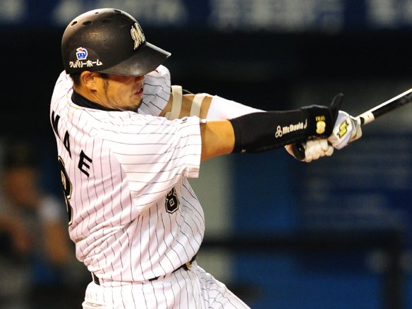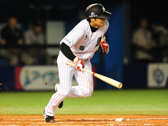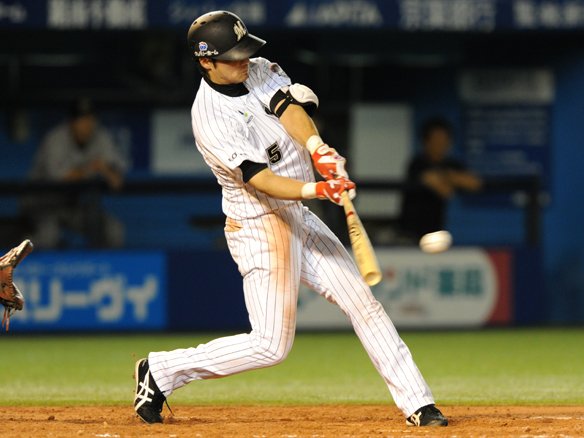 3番 井口 左安 2-2からの外角のストレートを巻き込むように打つと、鋭い打球がショートの頭上を越えていった! |