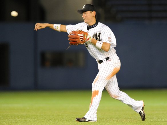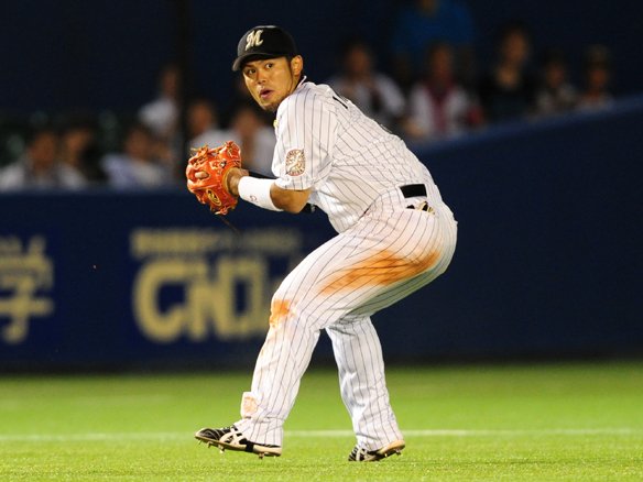 6番 里崎 遊ゴ 1-1から外角低めのボールを打ちにいくと、打球は二遊間へ。回り込んだショートにベース後ろで捕球されると、そのまま2塁にトスされた。 |